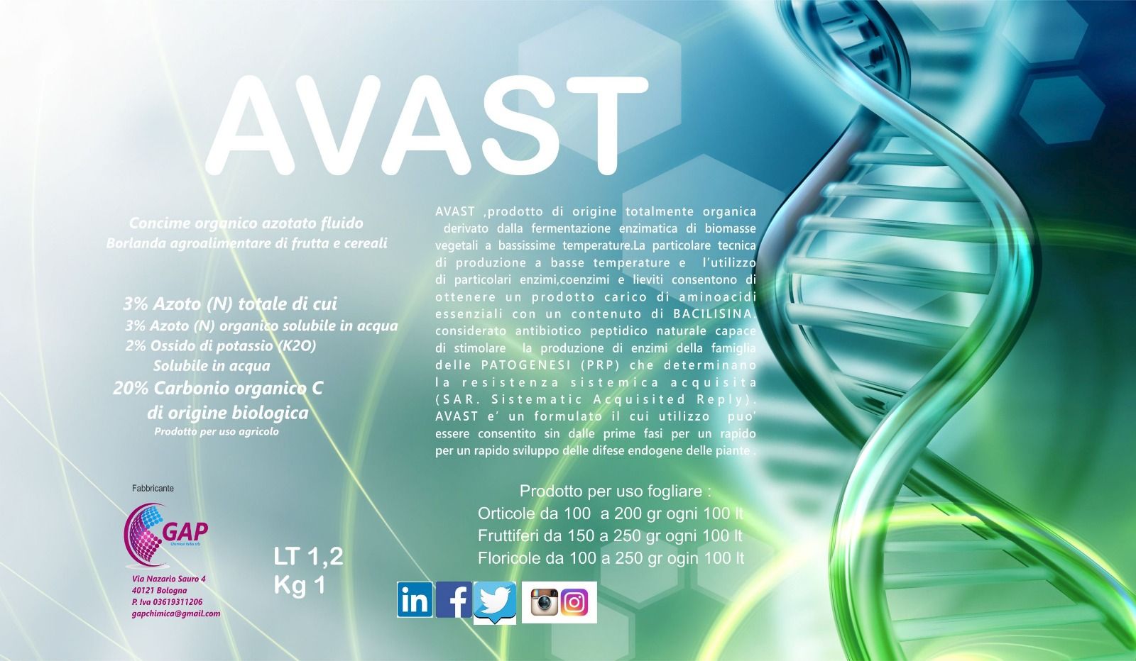 AVAST è un prodotto di origine totalmente organica derivato dalla fermentazione enzimatica di biomasse vegetali a bassissime temperature. La particolare tecnica di produzione a basse temperature e l’utilizzo di particolari enzimi, coenzimi e lieviti, consentono di ottenere un prodotto carico di aminoacidi essenziali con un contenuto di BACILISINA considerato antibiotico peptidico naturale, capace di stimolare la produzione di enzimi della famiglia delle PATOGENESI (PRP) che determinano la resistenza sistematica acquisita (SAR. Sistematic Acquisited Reply). Avast è un formulato il cui utilizzo può essere consentito sin dalle prime fasi per un rapido sviluppo delle difese endogene delle piante.